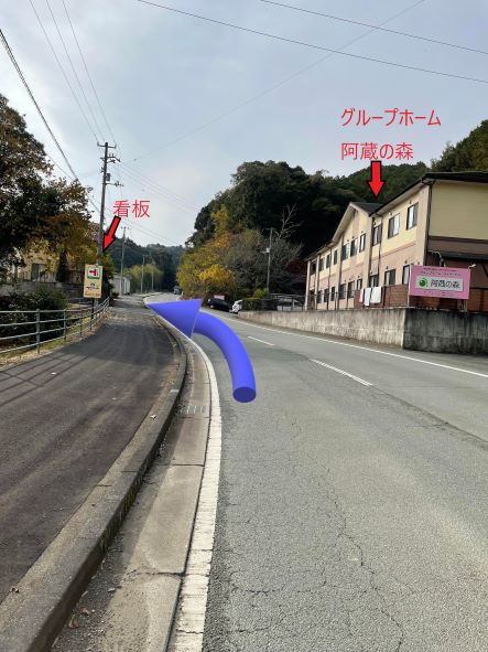 ③200mほどで右側に「グループホーム阿蔵の森」、左側に「おおず森のどうぶつ病院」の看板があるためその道(1車線)を」左折